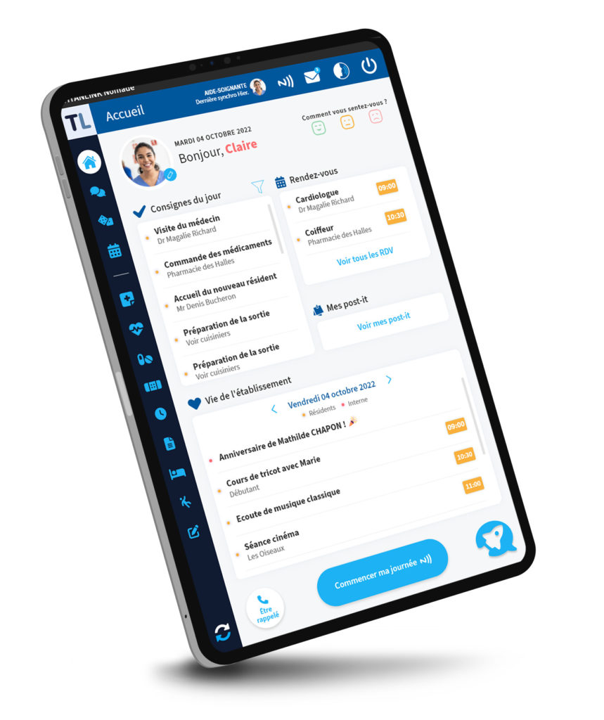 Sur nos chariots, de soins en chambre, à l’infirmerie pour les transmissions, en cuisine ou lors des animations, TITANLINK Nomade est devenu notre principal support de communication.