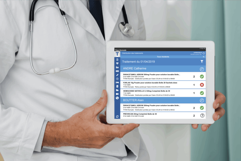 Les surveillances et prises de constantes sont facilitées grâce aux dispositifs médicaux connectés au logiciel TITAN : Thermomètre frontal, oxymètre de pouls et tensiomètre brassard. Les relevés effectués par les soignants sont automatiquement transférés dans le dossier du résident avec la possibilité d’envoyer une transmission avec dictée vocale et de planifier un suivi dans le cadre de constantes anormales. Pour vos équipes, c’est un gain de temps considérable et une sécurité (pas d’erreur de saisie possible).